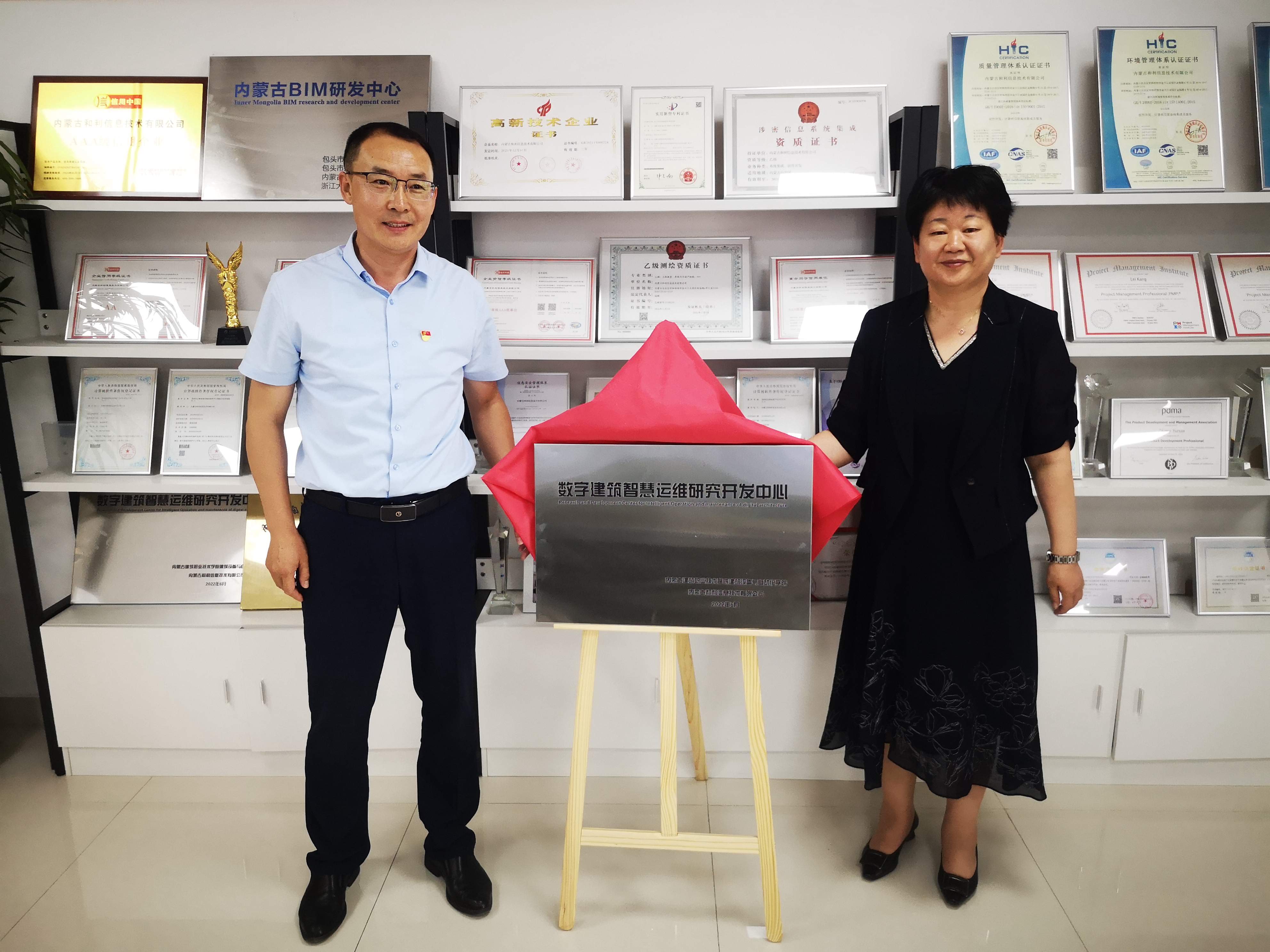 會議中,院長王文琪與集團黨支部書記、副總經(jīng)理、和利信息總經(jīng)理張偉進行“數(shù)字建筑智慧運維研究開發(fā)中心”簽約授牌儀式。